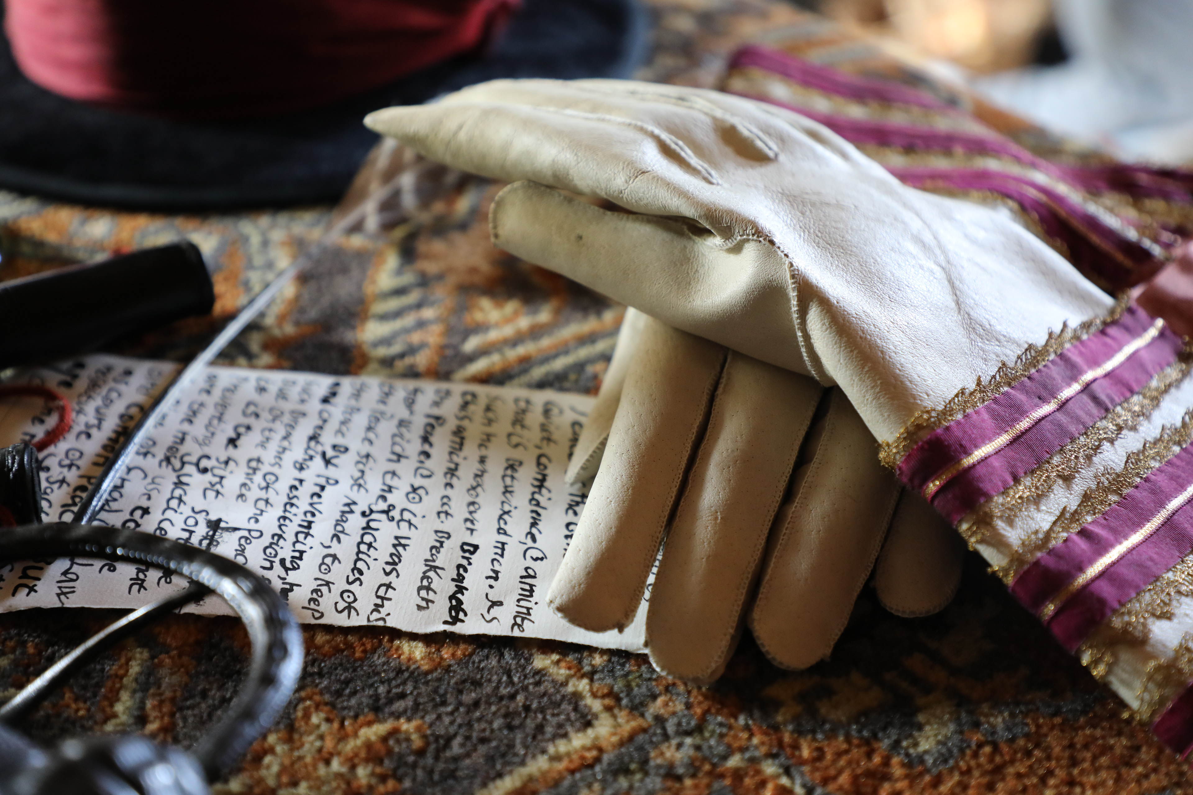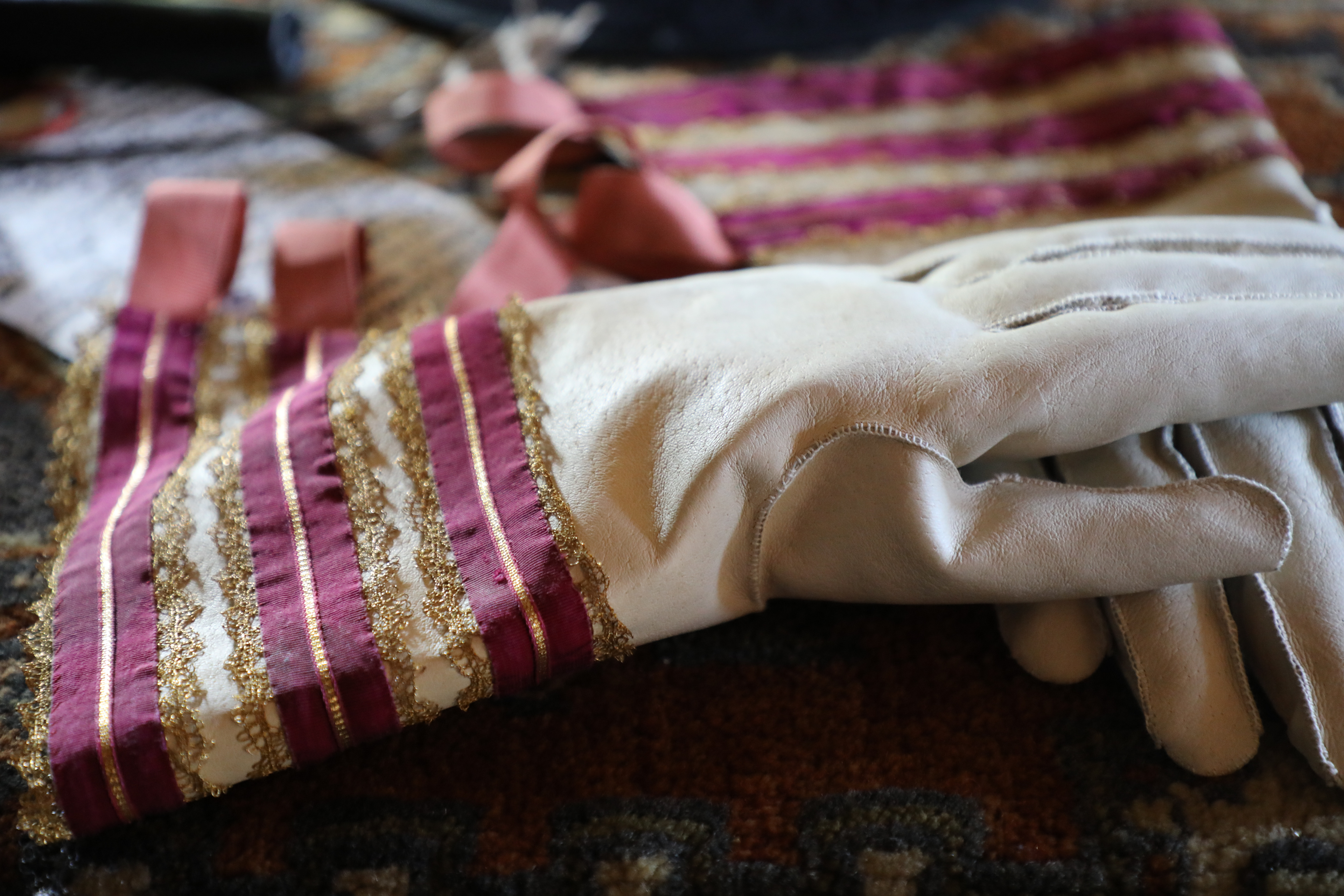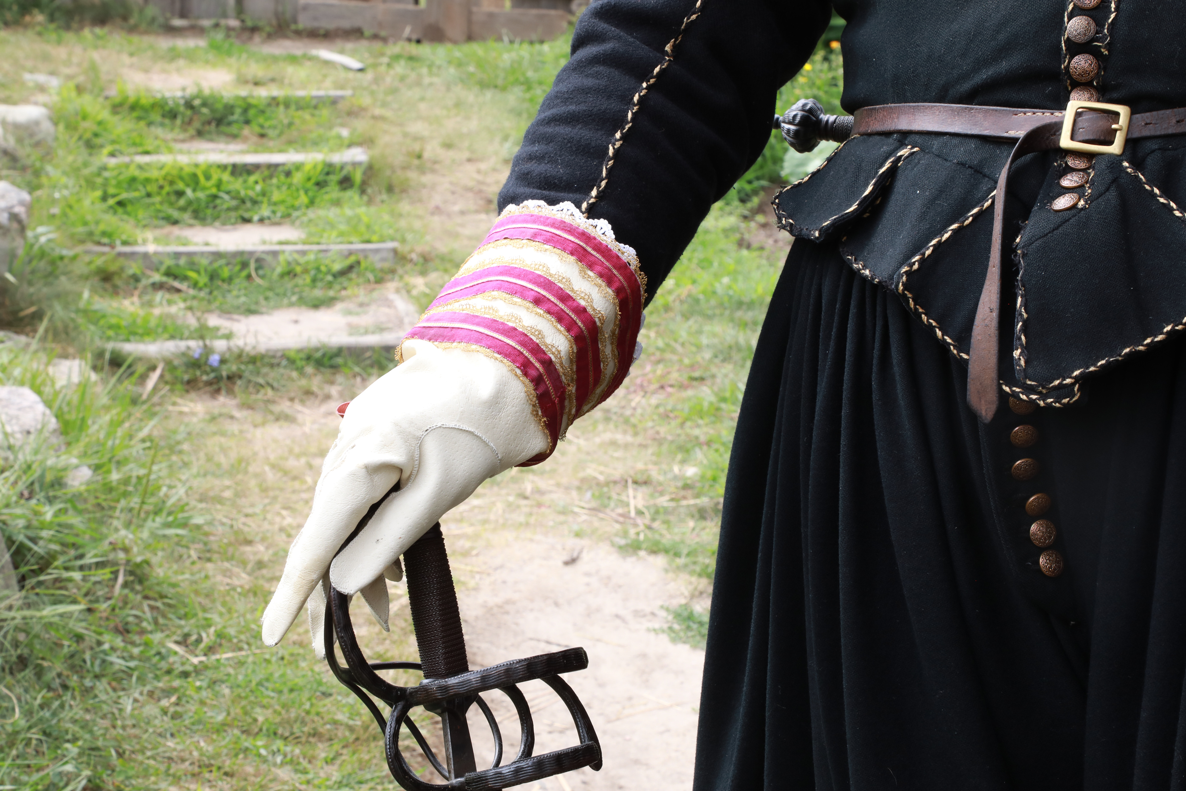 I developed these gloves to be period accurate to the late 1620’s in order to be worn and used at Plimoth Patuxet Museums as a part of their living history performances. The pattern was drafted based on extant gloves from the period and modified to fit the performer, featuring elongated fingers and asymmetric fourchettes to accent that even more. Detailing was based on other contemporary to the period examples, taking into consideration class and materials that would have been available. From there, the pattern was cut out of a pigskin leather and handstitched at 16 stitches per inch following period examples. Multiple trims and lace were handstitched together and then slip stitched to the gloves themselves.