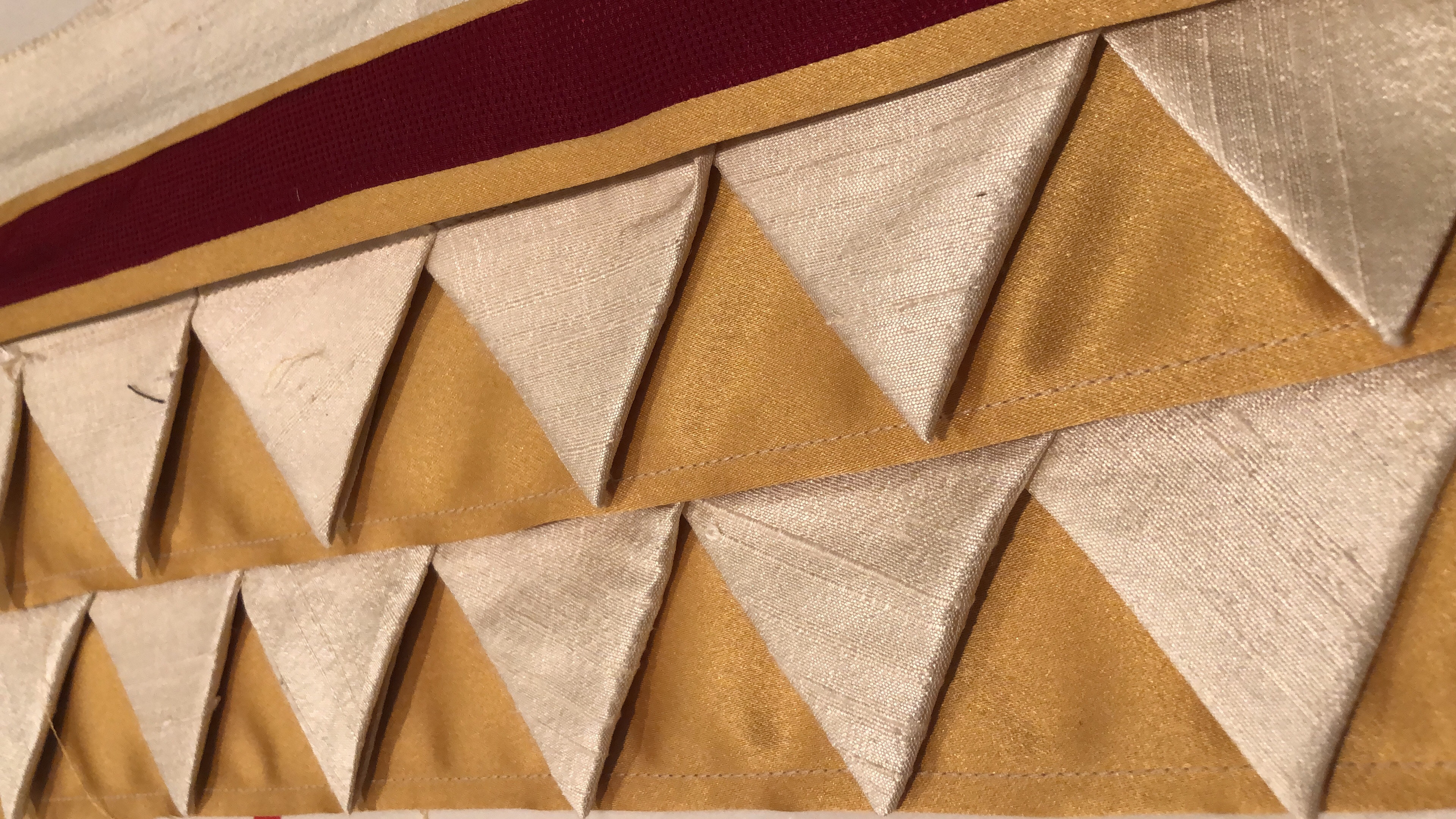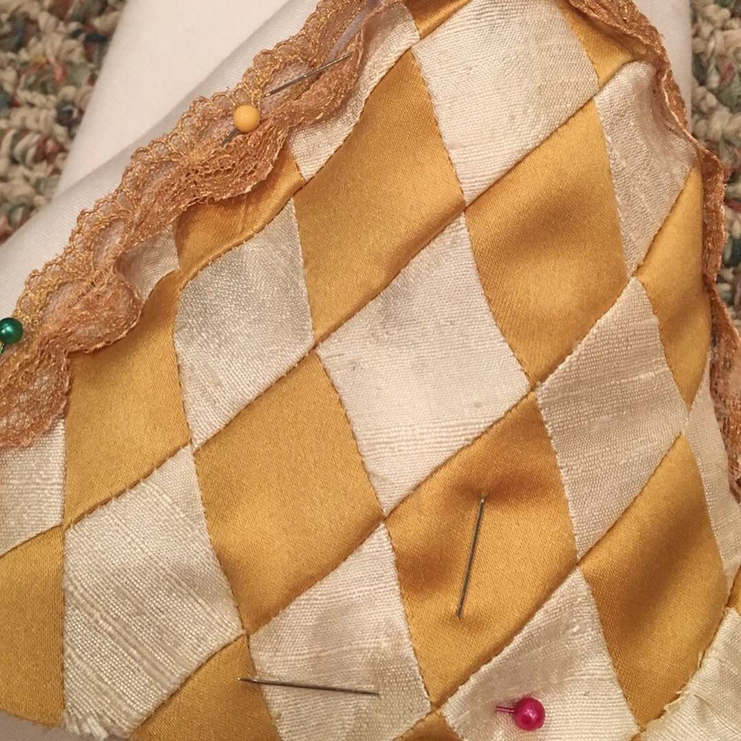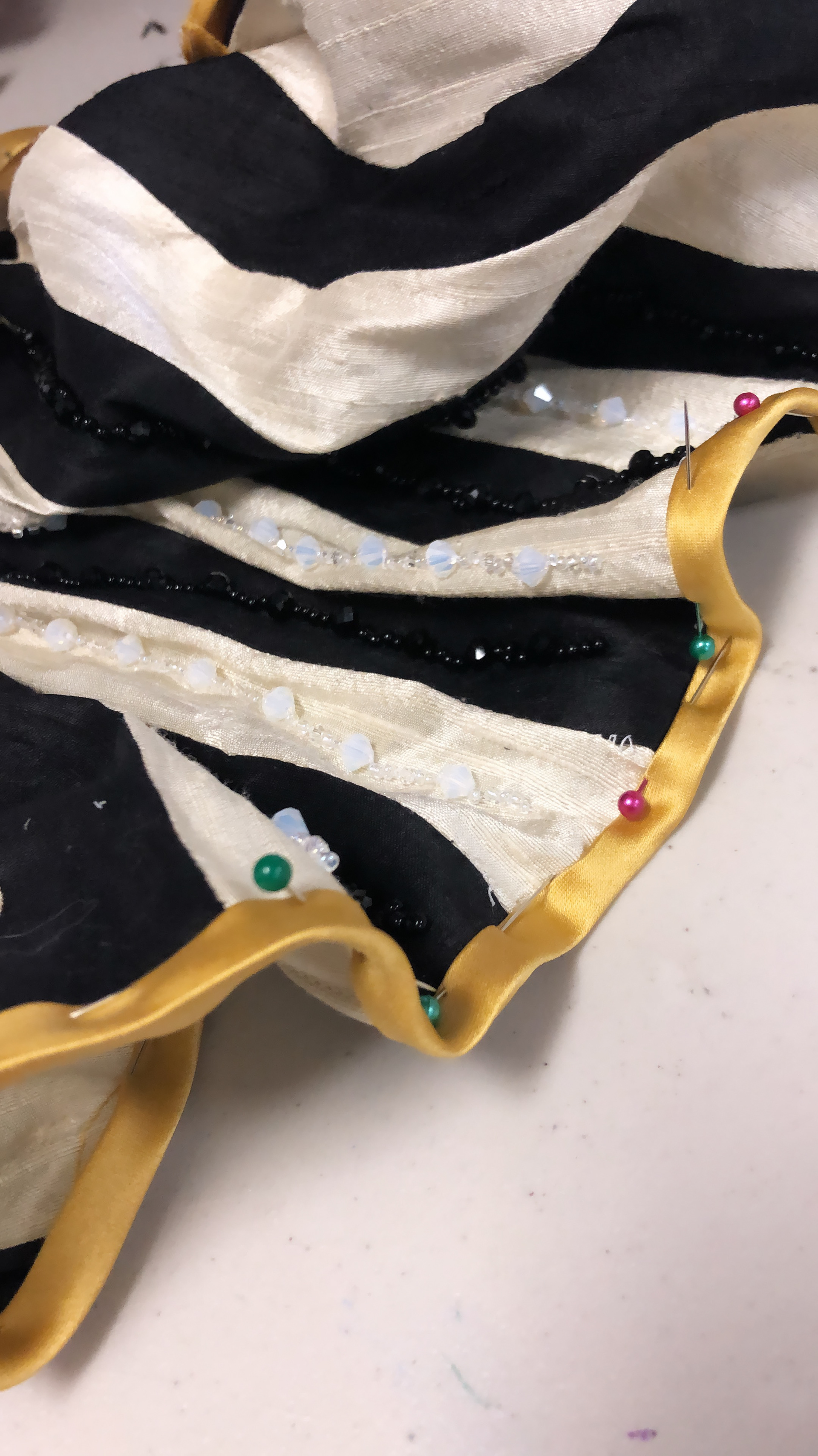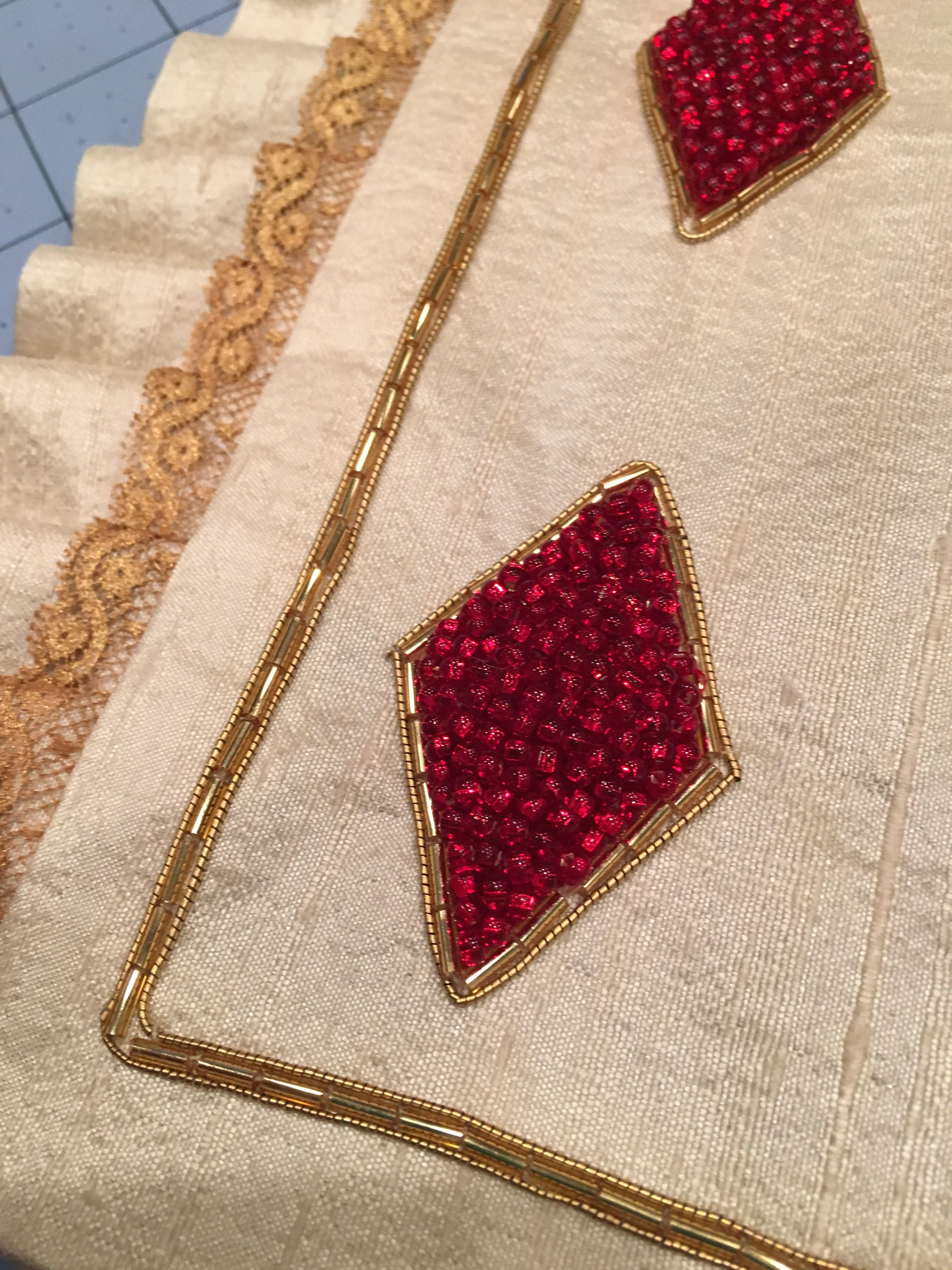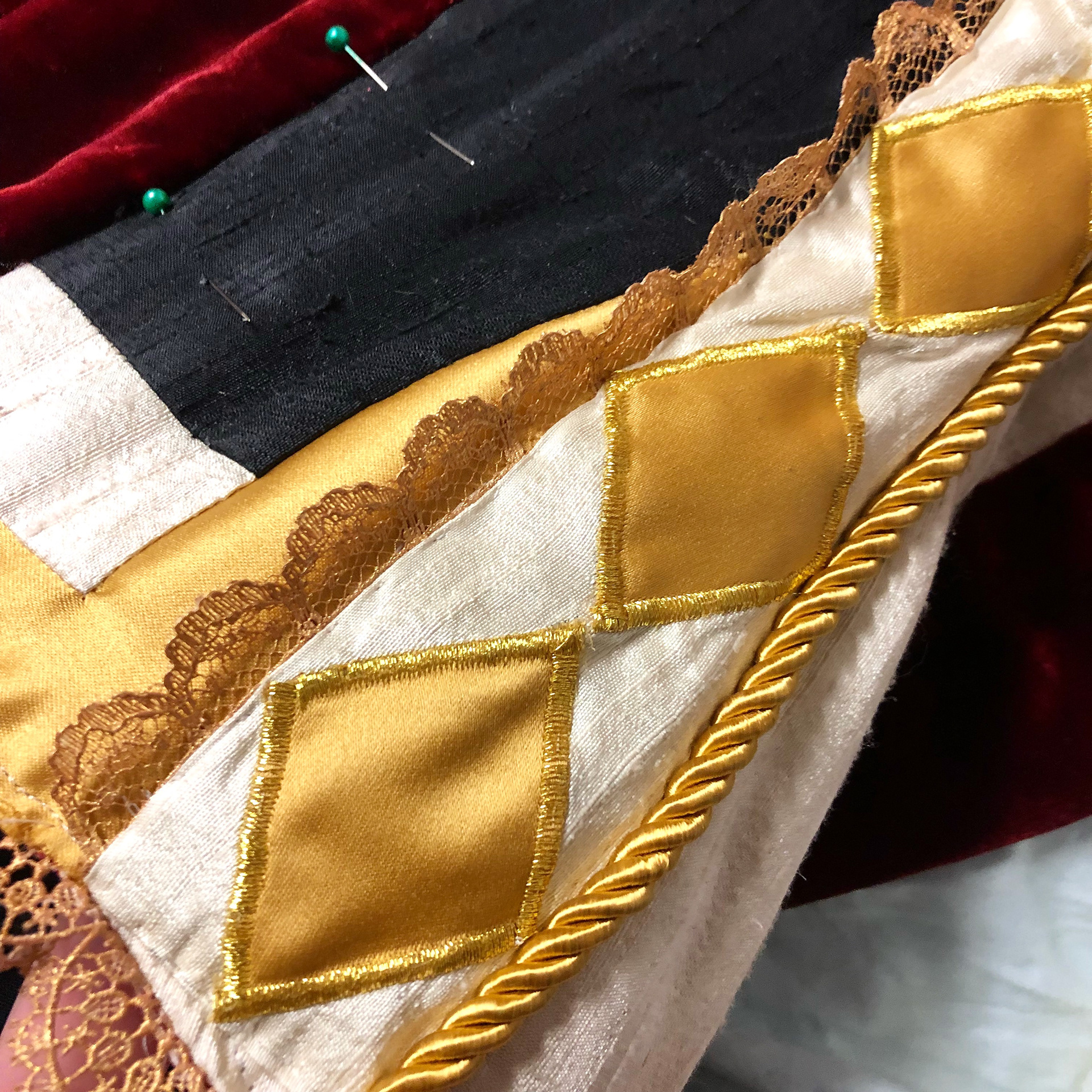 Additionally, I developed a rich aesthetic for this costume, using a mix of dupioni silk, taffeta and velvet in burgundy and cream, as well as adding lots of beading to the costume to have the design read as truly encrusted. Great care was taken to translate the proportions of the original illustration to my frame, keeping details and overall shape in mind.