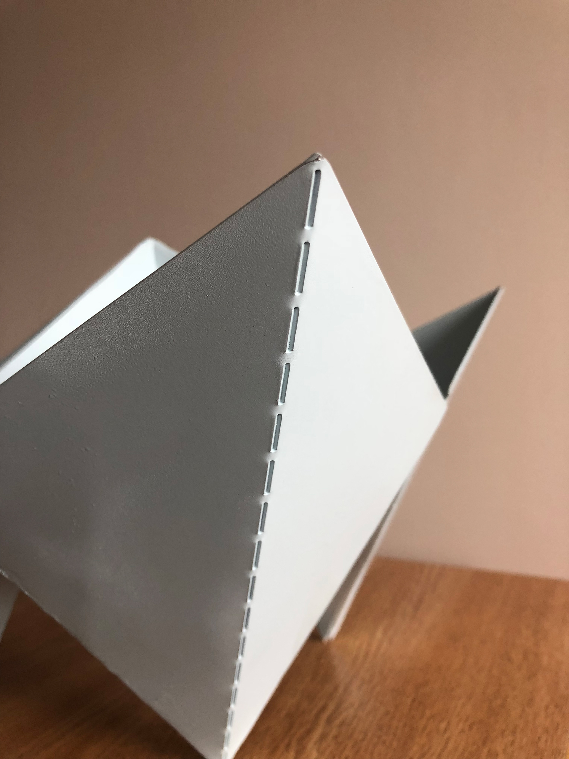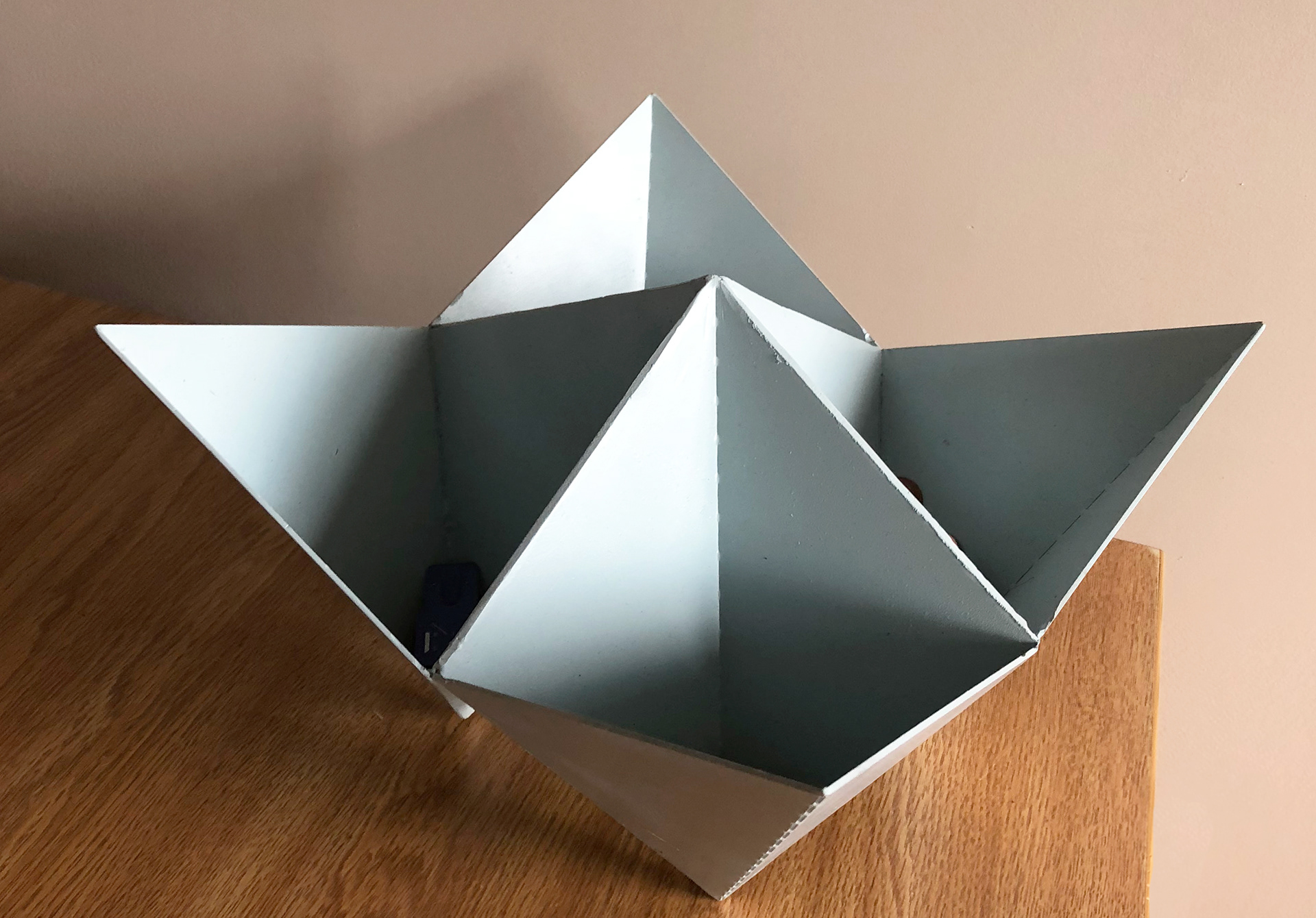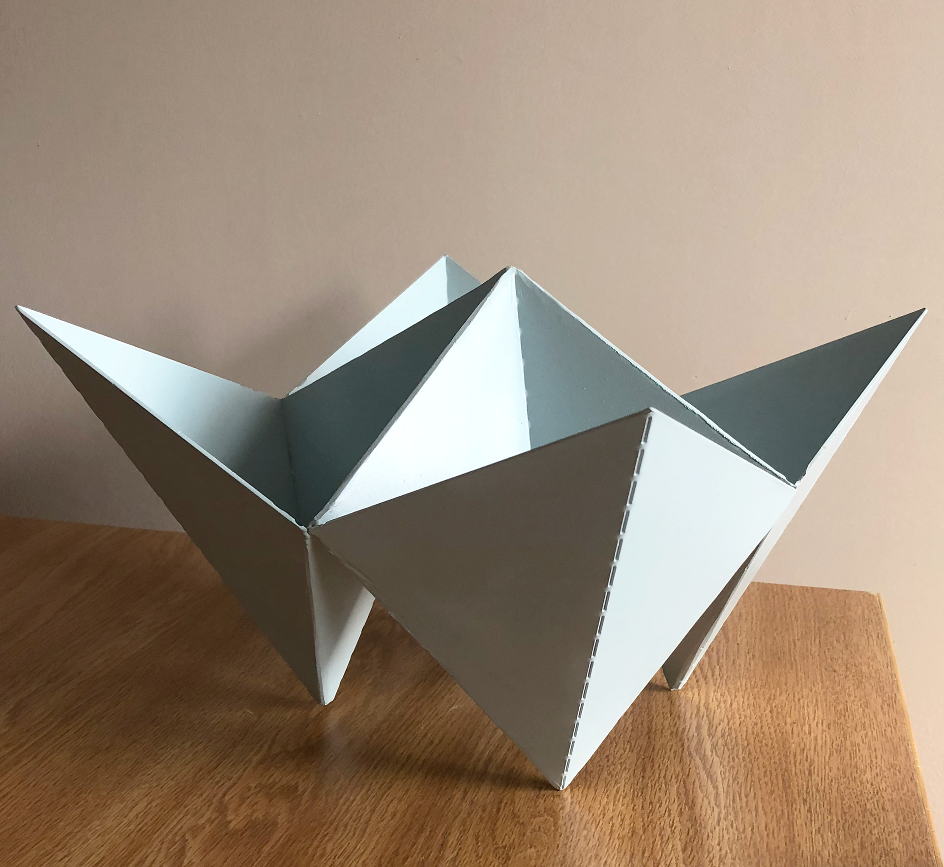 A metal bowl with forms taken from fortune tellers made in elementary school, made with laser cut mild steel and assembled primarily with TIG welding.